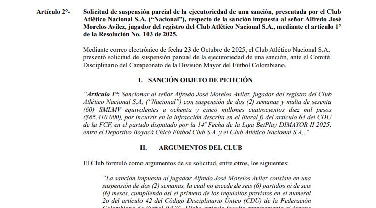 Este viernes, 24 de octubre, la Dimayor publicó un comunicado en el que anunció la reducción de la sanción de Alfredo Morelos.