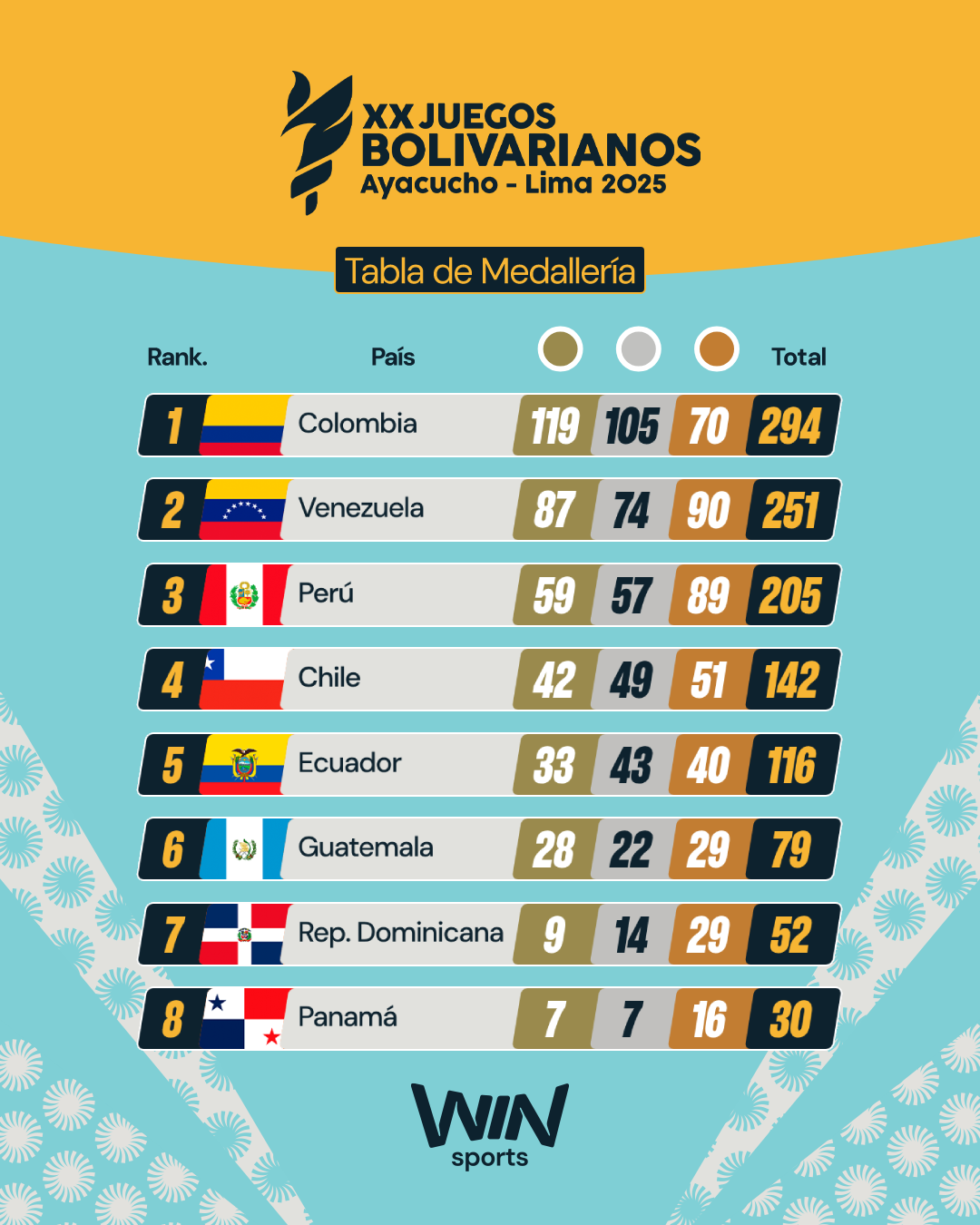 1. Colombia: 119 oros, 105 platas, 70 bronces — 294 en total