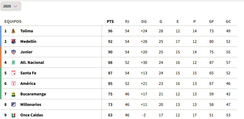 En concreto, Junior finalizó tercero en la reclasificación con 90 puntos, mientras que Santa Fe ocupó la quinta posición con 87 unidades.