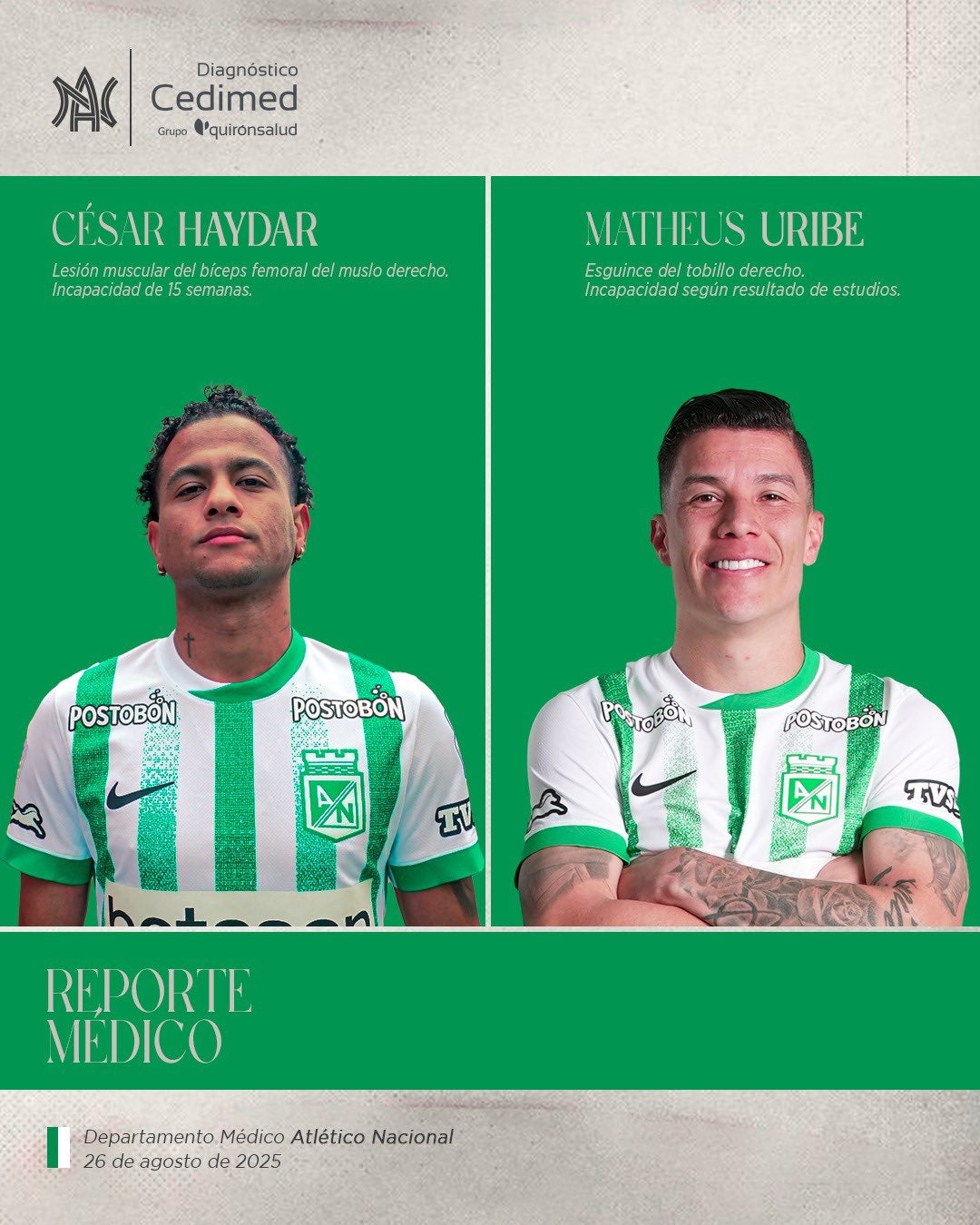 🚑🚨 Atlético Nacional reveló parte médico de Matheus Uribe