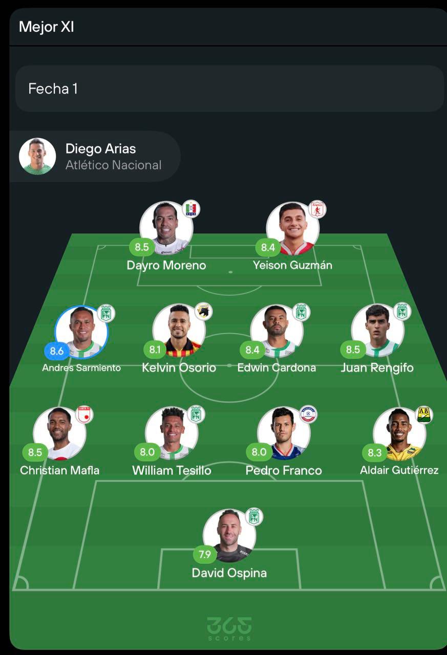 Ospina, Tesillo, Sarmiento, Cardona y Rengifo aparecieron en el mejor XI, reflejando la influencia verdolaga en todas las líneas del campo.