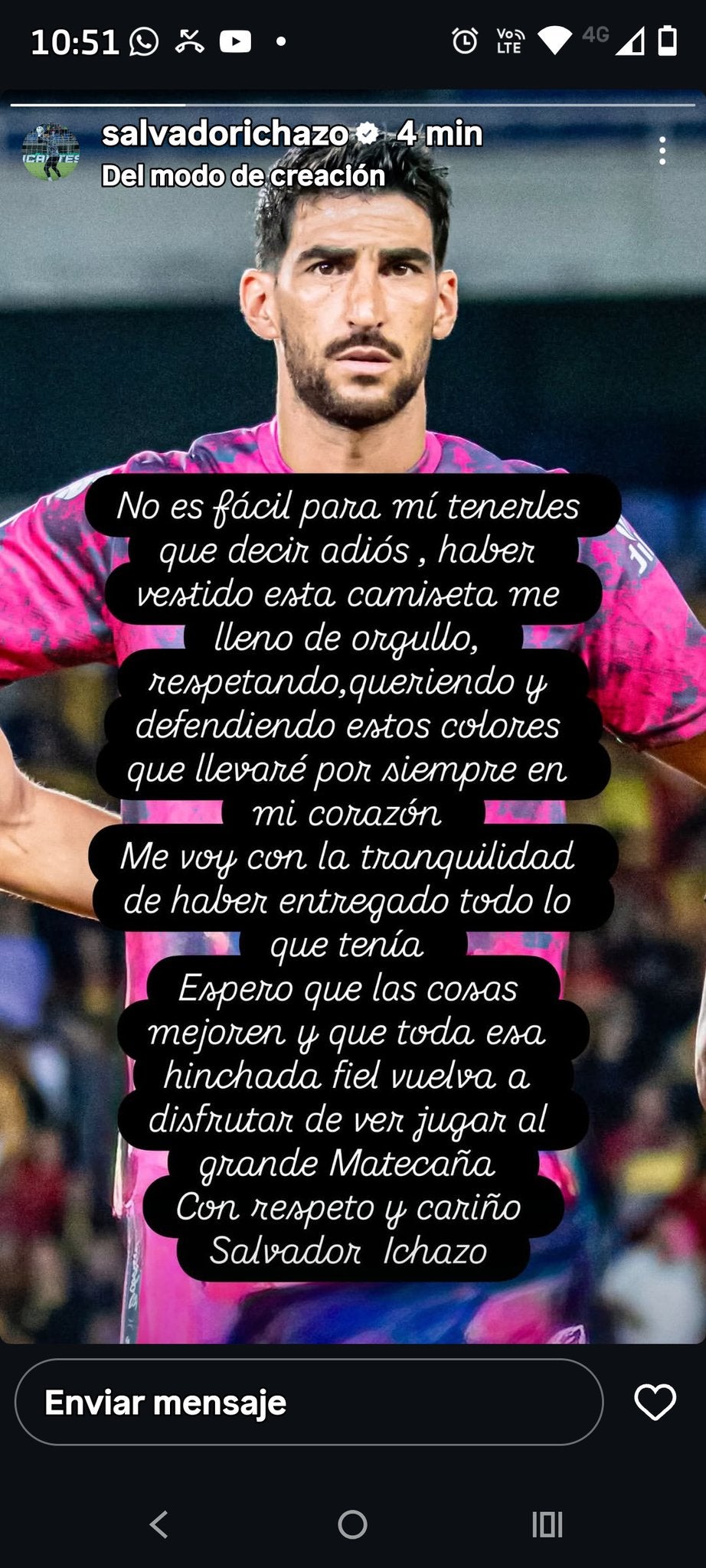 “No es fácil para mí tenerles que decir adiós, haber vestido esta camiseta me llenó de orgullo... Espero que las cosas mejoren y que toda esa hinchada fiel vuelva a disfrutar de ver jugar al grande 'matecaña', escribió el uruguayo en su mensaje de despedida.