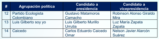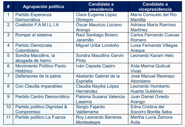 El proceso de inscripción, que inició el 31 de enero y concluyó el 13 de marzo, dejó oficialmente registradas 14 candidaturas a la presidencia y vicepresidencia de Colombia.