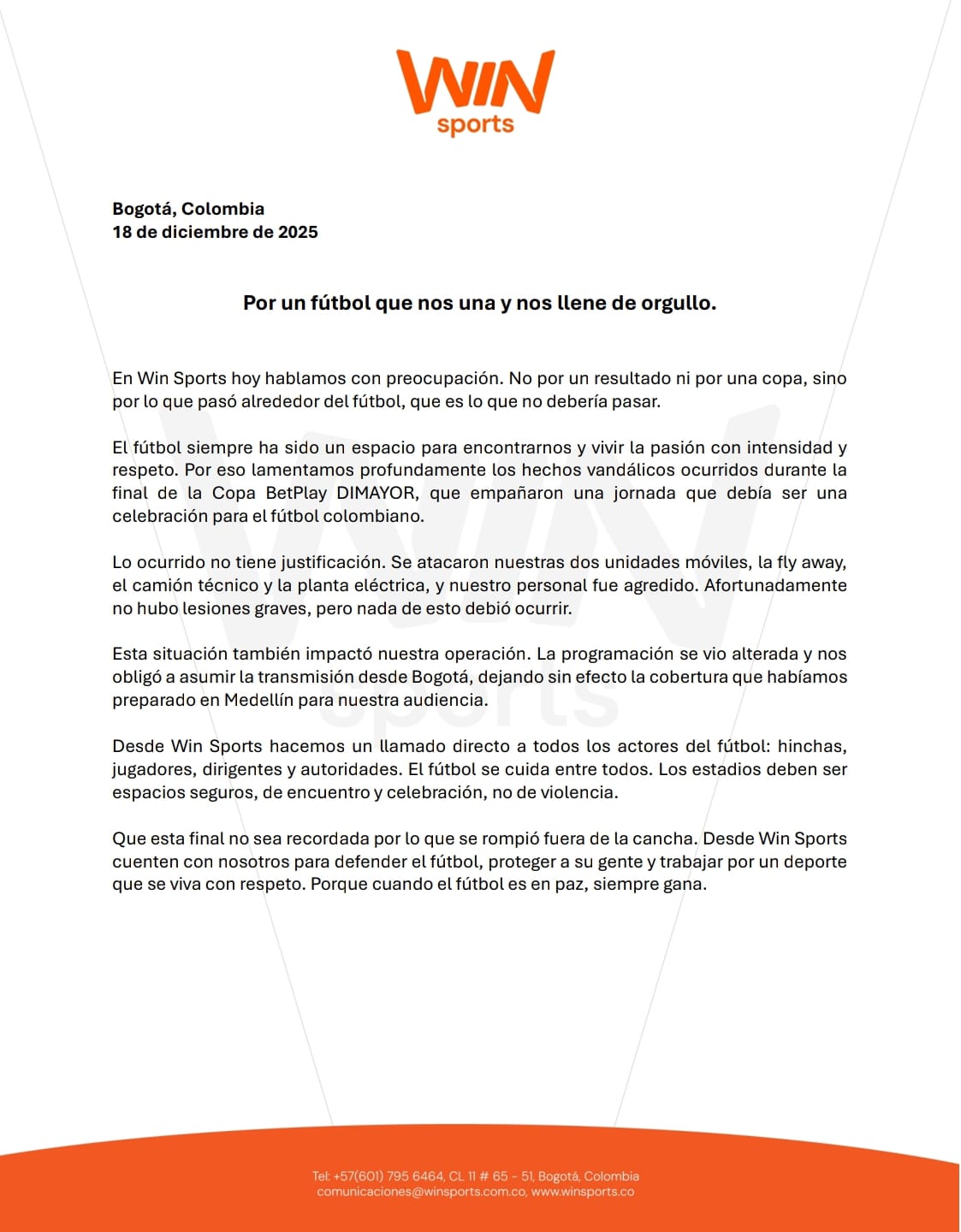 Que esta final no sea recordada por lo que se rompió fuera de la cancha. Desde Win Sports cuenten con nosotros para defender el fútbol, proteger a su gente y trabajar por un deporte que se viva con respeto. Porque cuando el fútbol es en paz, siempre gana.