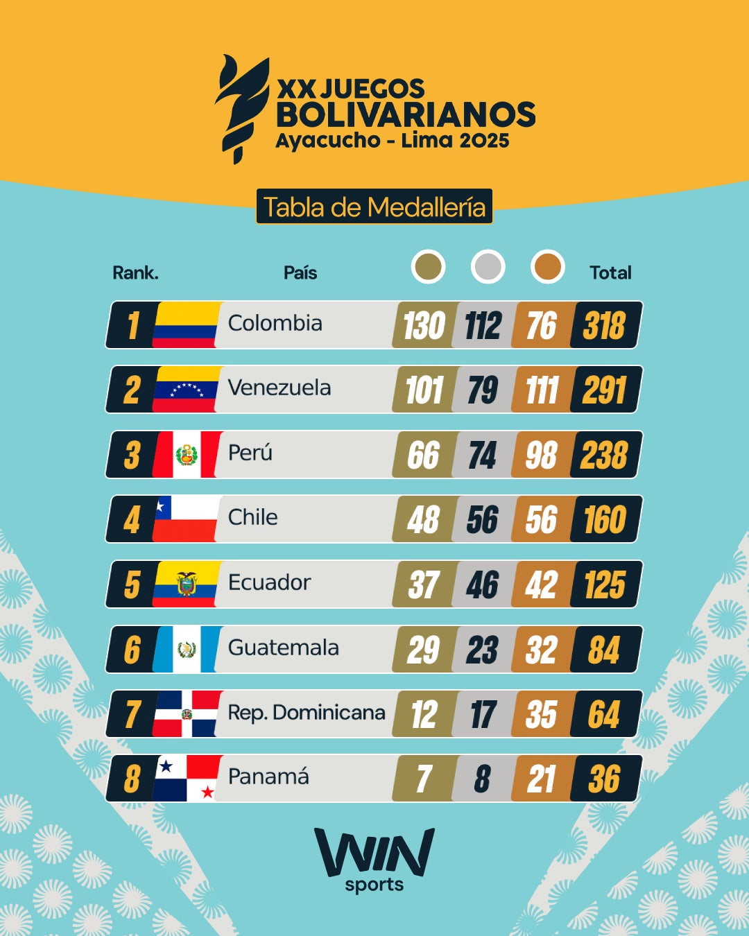 Con este rendimiento, la delegación nacional elevó su cuenta a 130 oros, 112 platas y 76 bronces para un total de 318 medallas, cifra que la mantiene con comodidad en lo más alto del medallero. Venezuela sigue en el segundo lugar con 101 oros, 79 platas y 111 bronces.