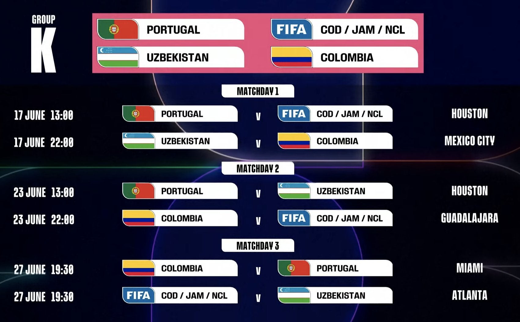 Colombia fue ubicada en el Grupo K, donde tendrá que enfrentar a la poderosa Portugal, a la debutante Uzbekistán y a la selección que resulte ganadora del repechaje intercontinental entre RD del Congo, Jamaica y Nueva Caledonia.